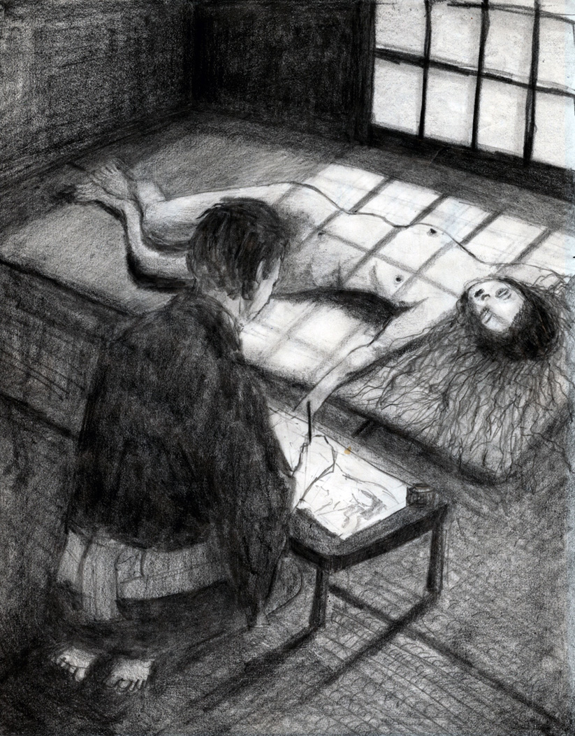 ……つまりその青年が、滅びかかっている自分の一家の血統を繋ぎ止めるべく、自分を恋い慕っている美しい従妹と結婚式を挙げる事になりました、その前の晩の夜半過ぎに、その青年が、思いもかけぬ夢中遊行を起しまして、その少女を絞殺してしまいました。そうしてその少女の屍体を眼の前に横たえながら、冷静な態度で紙を拡げて写生をしていた……という、非常に特異な、不可思議な事実が曝露されまして、大評判になってからの事で御座います……が……同時に、その青年の属する一家の血統を、そんなにまで悲惨な状態に陥れてしまったのが、何の目的であったかという事実とその犯人が何人であるかという、この二つの根本問題だけは、今日までも依然として不明のままになっているという……どこまで奇怪、深刻を極めているか判然らない事件で御座います。