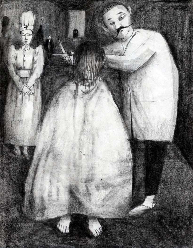 その小男は頭をクルクル坊主の五分刈にして、黒い八の字髭をピンと生やして、白い詰襟の上衣に黒ズボン、古靴で作ったスリッパという見慣れない扮装をしていた。四角い黒革の手提鞄と、薄汚ない畳椅子を左右の手に提げていたが、あとから這入って来た看護婦が、部屋の中央に湯気の立つボール鉢を置くと、その横に活溌な態度で畳椅子を拡げた。それから黒い手提鞄を椅子の横に置いて、パッと拡げると、その中にゴチャゴチャに投げ込んであった理髪用の鋏や、ブラシを葢の上に掴み出しながら、私を見てヒョッコリとお辞儀をした。「ササ、どうぞ」という風に……。すると若林博士も籐椅子を寝台の枕元に引き寄せながら、私に向って「サア、どうぞ」というような眼くばせをした。