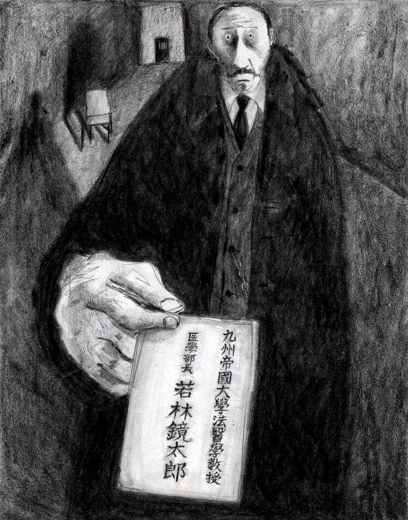 その玄関の扉はピッタリと閉め切ってあったが多分まだ朝が早いせいであったろう。その扉の上の明窓から洩れ込んで来る、仄青い光線をたよりに、両側に二つ並んでいる急な階段の向って左側を、ゴトンゴトンと登り詰めて右に折れると、今度はステキに明るい南向きの廊下になって、右側に「実験室」とか「図書室」とかいう木札をかけた、いくつもの室が並んでいる。その廊下の突当りに「出入厳禁……医学部長」と筆太に書いた白紙を貼り附けた茶褐色の扉が見えた。