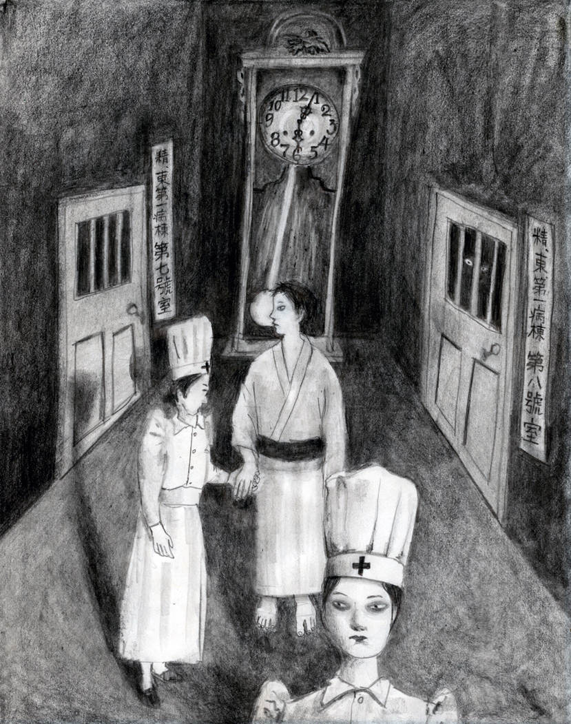 若林博士は扉の外まで見送って来たが、途中でどこかへ行ってしまったようであった。扉の外は広い人造石の廊下で、私の部屋の扉と同じ色恰好をした扉が、左右に五つ宛、向い合って並んでいる。その廊下の突当りの薄暗い壁の凹みの中に、やはり私の部屋の窓と同じような鉄格子と鉄網で厳重に包まれた、人間の背丈ぐらいの柱時計が掛かっているが、多分これが、今朝早くの真夜中に……ブウンンンと唸って、私の眼を醒まさした時計であろう。どこから手を入れて螺旋をかけるのか解らないが、旧式な唐草模様の付いた、物々しい恰好の長針と短針が、六時四分を指し示しつつ、カックカックと巨大な真鍮の振子球を揺り動かしているのが、何だか、そんな刑罰を受けて、そんな事を繰り返させられている人間のように見えた。その時計に向って左側が私の部屋になっていて、扉の横に打ち付けられた、長さ一尺ばかりの白ペンキ塗の標札には、ゴジック式の黒い文字で「精、東、第一病棟」と小さく「第七号室」とその下に大きく書いてある。患者の名札は無い。